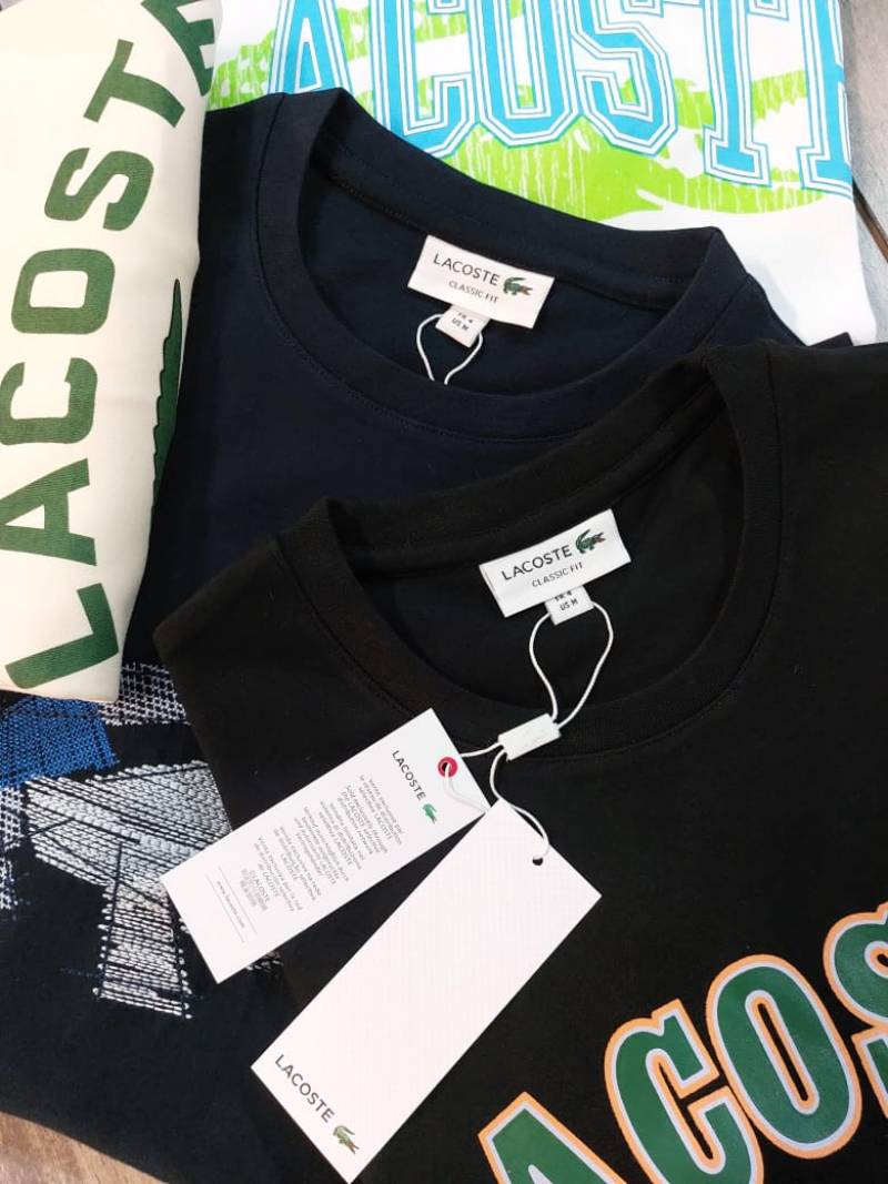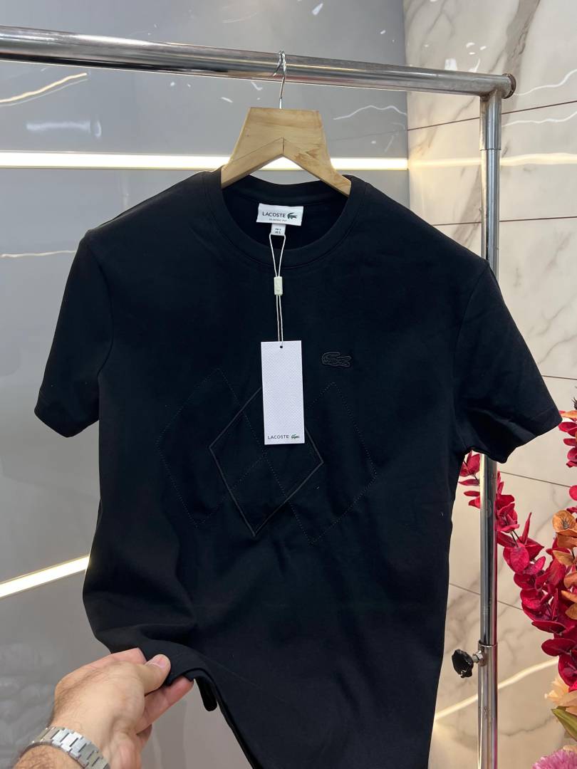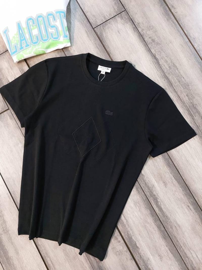 Lacost e Black Premium Imported 240 GSM Interlock Lycra Fabric Round Neck with Front Printed Design Tshirt 3316