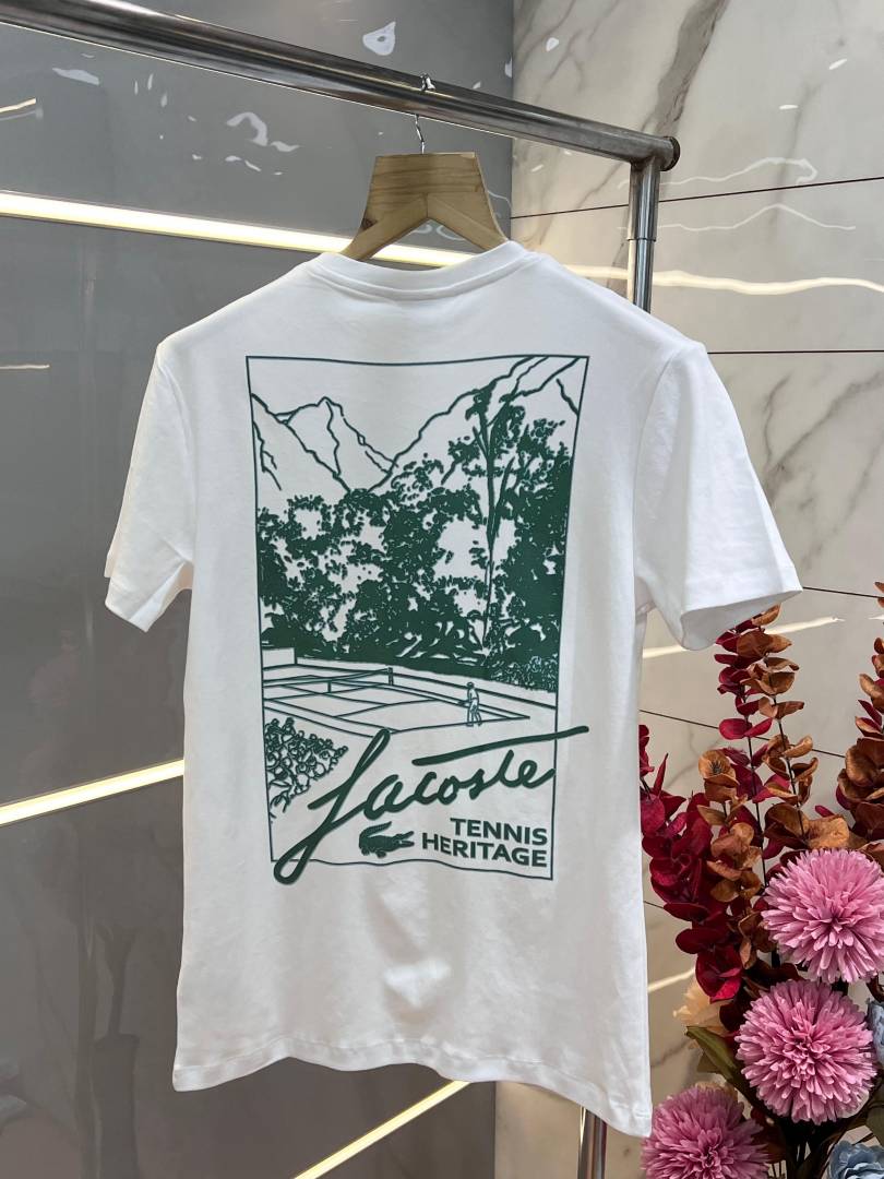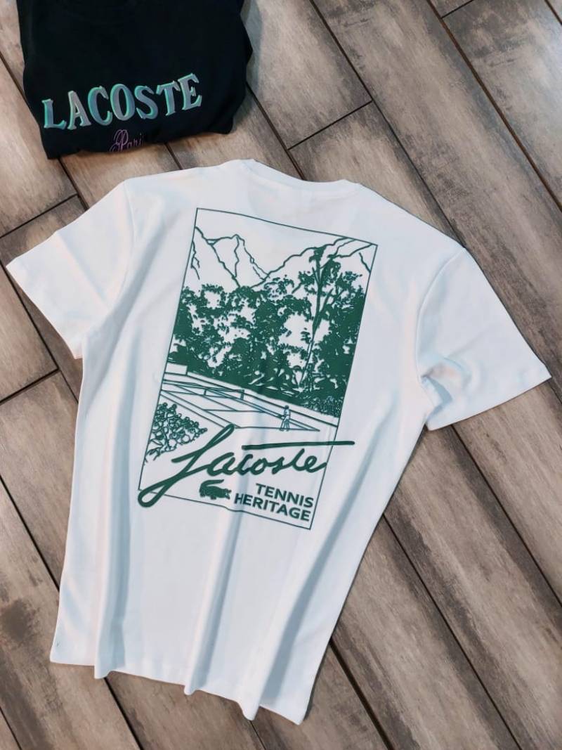 Lacost e White Premium Imported 240 GSM Interlock Lycra Fabric Round Neck with Back Printed Design Tshirt 3318